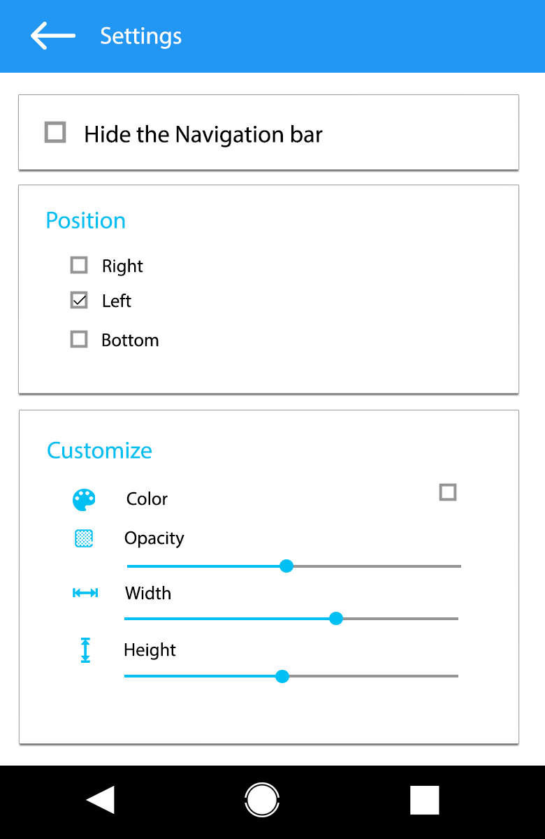 Touch control to use all the navigation bar menu in your mobile screen renders full ease and access. Simple swipe to show and auto hide the navigation bar. Change background colors and button type to completely customize the navigation bar back, home and recent button.