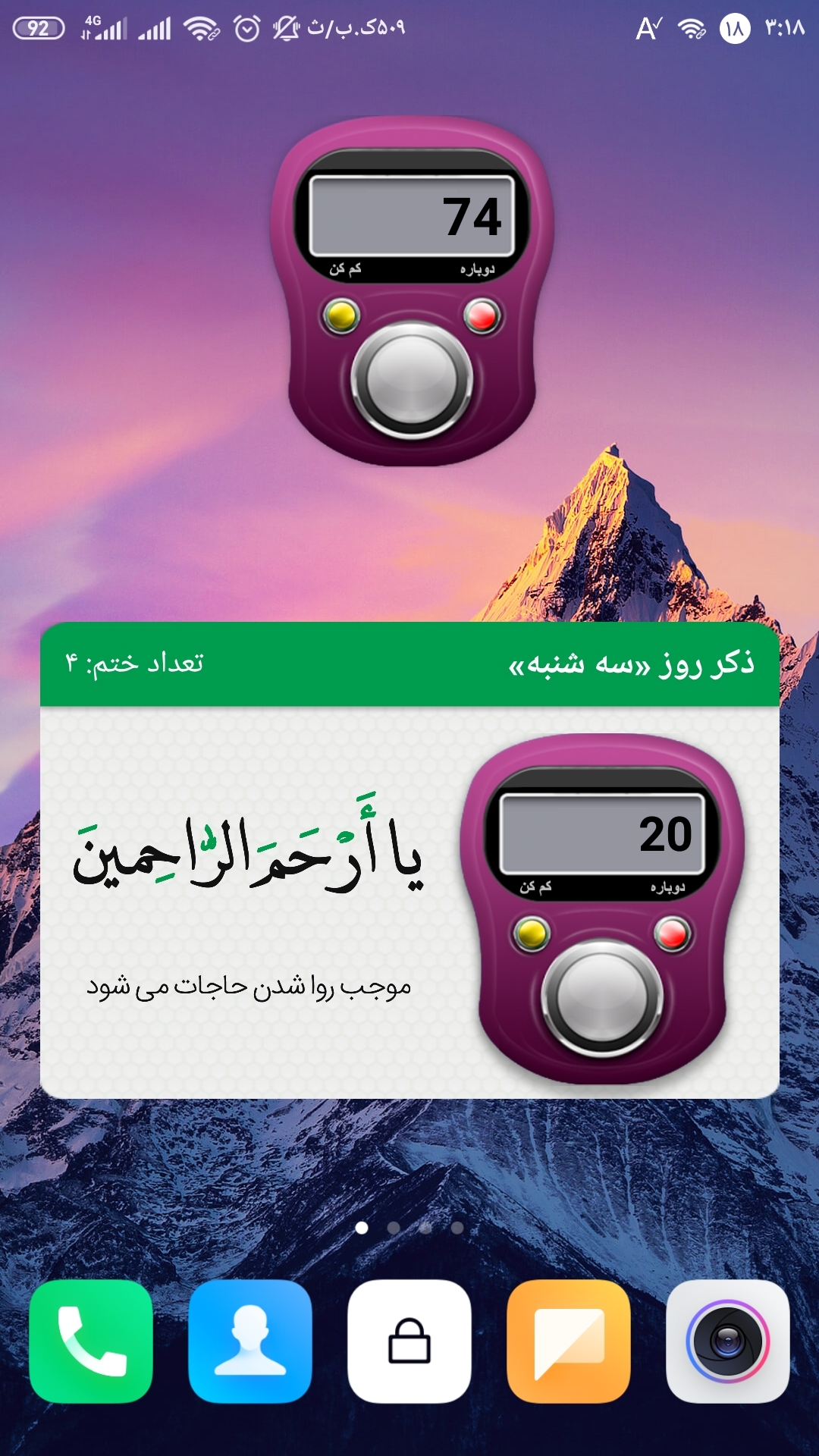 برنامه ذکر شمار با محیطی زیبا و کاربر پسند دارای 2 ویجت یا ابزارک در رنگ های مختلف که یکی برای شمارش اذکار روز های هفته و یکی برای شمارش صلوات و اذکار دیگر است