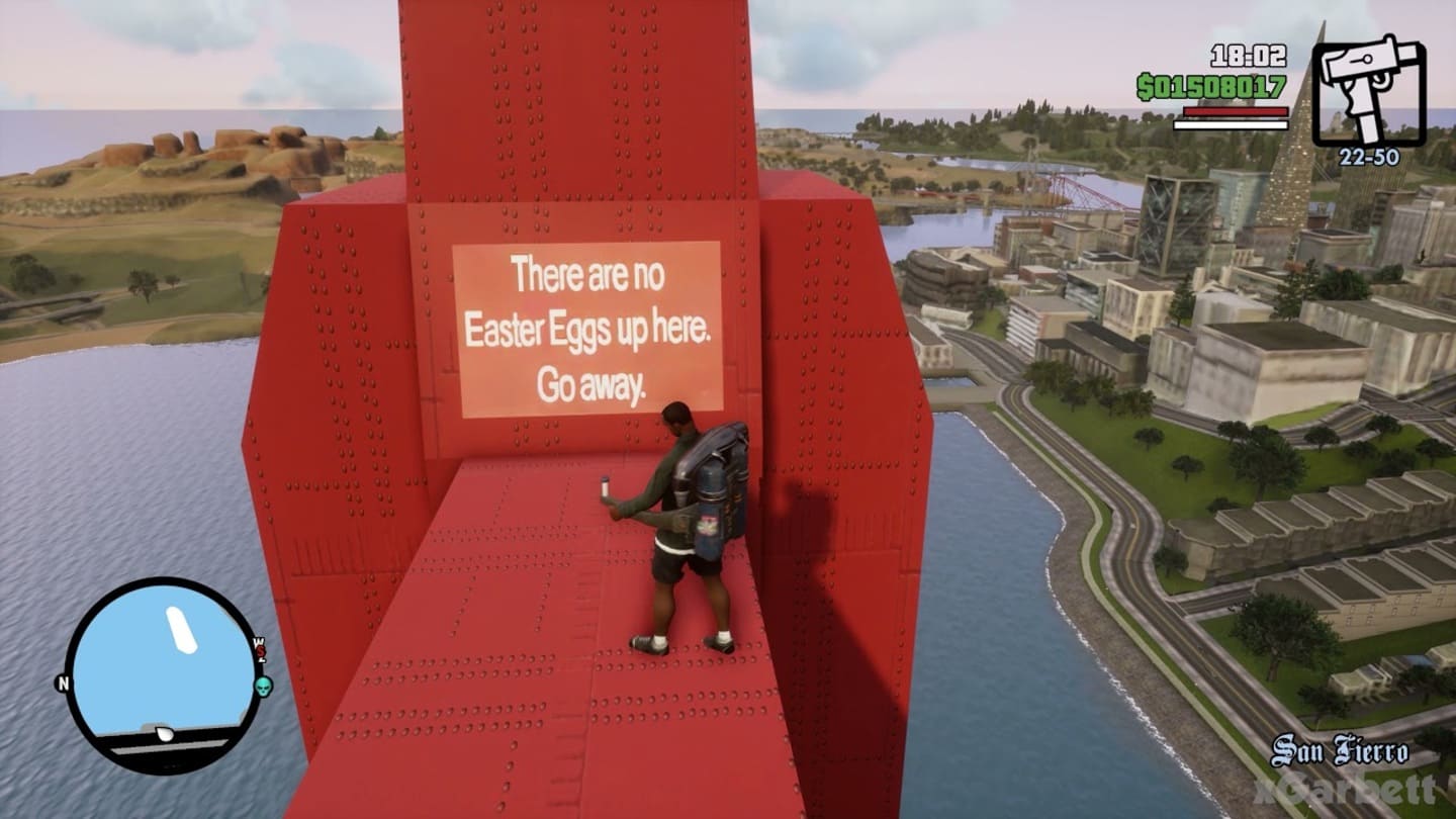 برای بسیاری از ما اولین مواجهه با ایستراگ و پیدا کردن آنها، با بازی GTA: San Andreas رقم خورده است. این بازی پر بود از ایستراگ و راز‌های مخفی، از ارجاعات پنهان به بازی‌های دیگر گرفته تا مکان‌های وهم‌انگیز مثل گور دسته‌جمعی مرموز نزدیک منطقه ۶۹. Gant Bridge یکی از مکان‌های بازی است که معادل Golden Gate Bridge در شهر سان‌فرانسیسکو است. بازیکنان بسیاری سعی کردند به بالای پل بروند به امید اینکه یک ایستراگ پیدا کنند. اگر چه واقعاً یک ایستراگ آنجا وجود دارد، اما دقیقاً آن چیزی نیست که انتظارش را دارید.